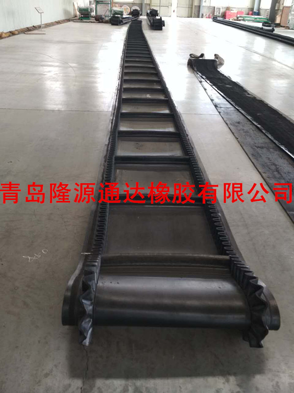 大倾角输送带一般和波状挡边输送机配合使用,其使用角度一般>=30℃,也可和输送带式输送机配套使用,水平短距离输送(此时一般不设隔板)波形挡边输送带采用成槽度不大于0.03的基带和挡边,横隔板(水平输送可不要),经两次硫化制成。